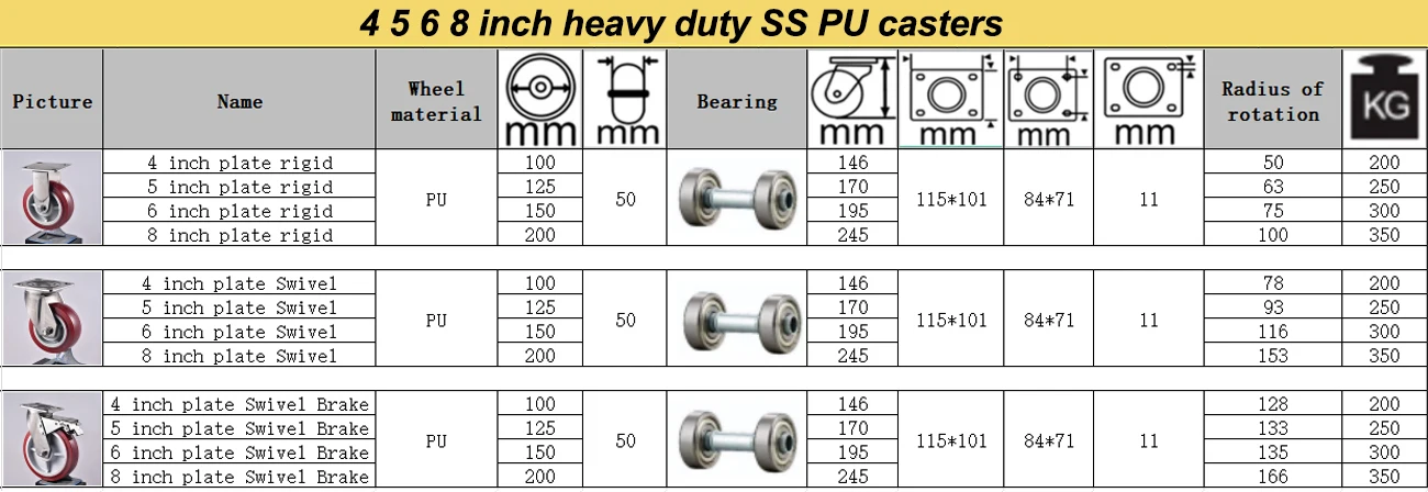 Load Capacity: 4in 200kg/5in 250kg/6in 300kg/8in 350kg: 4in 200kg/5in 250kg/6in 300kg/8in 350kg